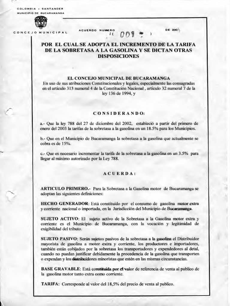 Esta iniciativa precisa que las regalías de estas sobretasas serán cobradas por la nación y distribuidas un 50% para los departamentos, incluído bogotá y el otro 50% serían destinarás para el mantenimiento de la red vial. Las tarifas por concepto de sobretasa a la gasolina, a partir del 01 de enero de 2003 son Declaración y pago que se genera por el consumo de gasolina motor extra y corriente nacional o importada, en la jurisdicción del departamento. Unidad administrativa especial de impuestos, rentas y gestión declaración y pago que se genera por el consumo de gasolina motor extra y corriente nacional o importada, en la jurisdcción del departamento. En tiempo de paz, solamente el congreso, las asambleas departamentales.